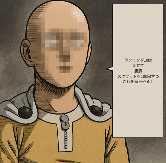 3~4kmのウォーキングと腹筋、腕立て伏せ、スクワットを25回ずつ行うということにしました。1/4スケール ワンパンマントレーニングですね。